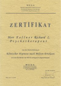 ![]() Zertifikat Klinische Hypnose (MEGA) | ![]() Hypnosystemische Beratung (MSc) (Milton Erickson Akademie & SFU) |